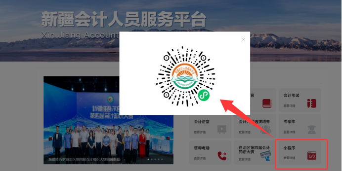 1. 进入新疆会计人员服务平台首页,点击小程序,手机微信扫码;